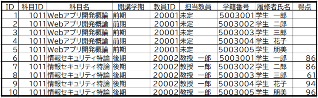 科目IDから担当教員IDを参照し、さらに担当教員IDに紐づく教員名が参照される仕組みになっています。