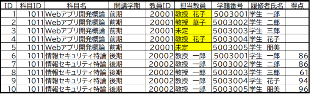このような構造にしておけば、教員ID「20001」に紐づく教員名を「未定」から「教授 花子」に1ヶ所更新するだけで、関係する全てのレコードが実質的に更新されたことになります。