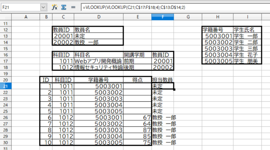 リレーションを二重に(科目IDに紐づく教員IDを参照し、さらに教員IDに紐づく教員名を参照)しているため、VLOOKUP関数をネスト(入れ子)にします。