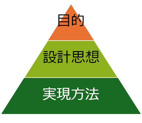 上から順に,「目的」,「設計思想(戦略)」,「実現方法(戦術)」と続きます.システムに求められるセキュリティ要件(目的)に基づいて,設計思想を立案し,その設計思想に基づいて具体的な実現方法を考えるといった要領です.