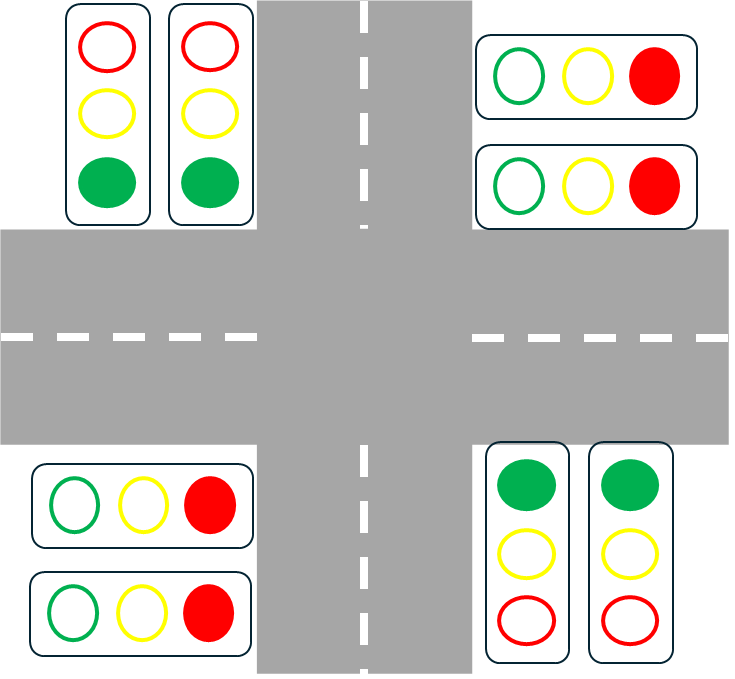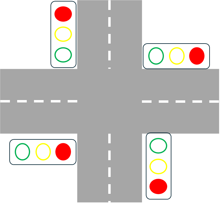 「フェールセーフ」は,障害発生時にシステムを安全(セーフ)側に持っていくことです.以下にあるような十字路の交差点に設置された信号機を例に考えてみましょう.
