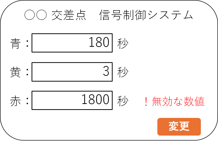 赤色灯火の点灯時間について,「1800秒(30分)」という明らかに異常な値が入力されています.こうした異常値をシステムが無批判に受け入れてしまうと,誤動作や思わぬ挙動を引き起こす原因になってしまいます.(赤信号で30分も待たされる交差点が実在したら,たまったものではないですよね.)